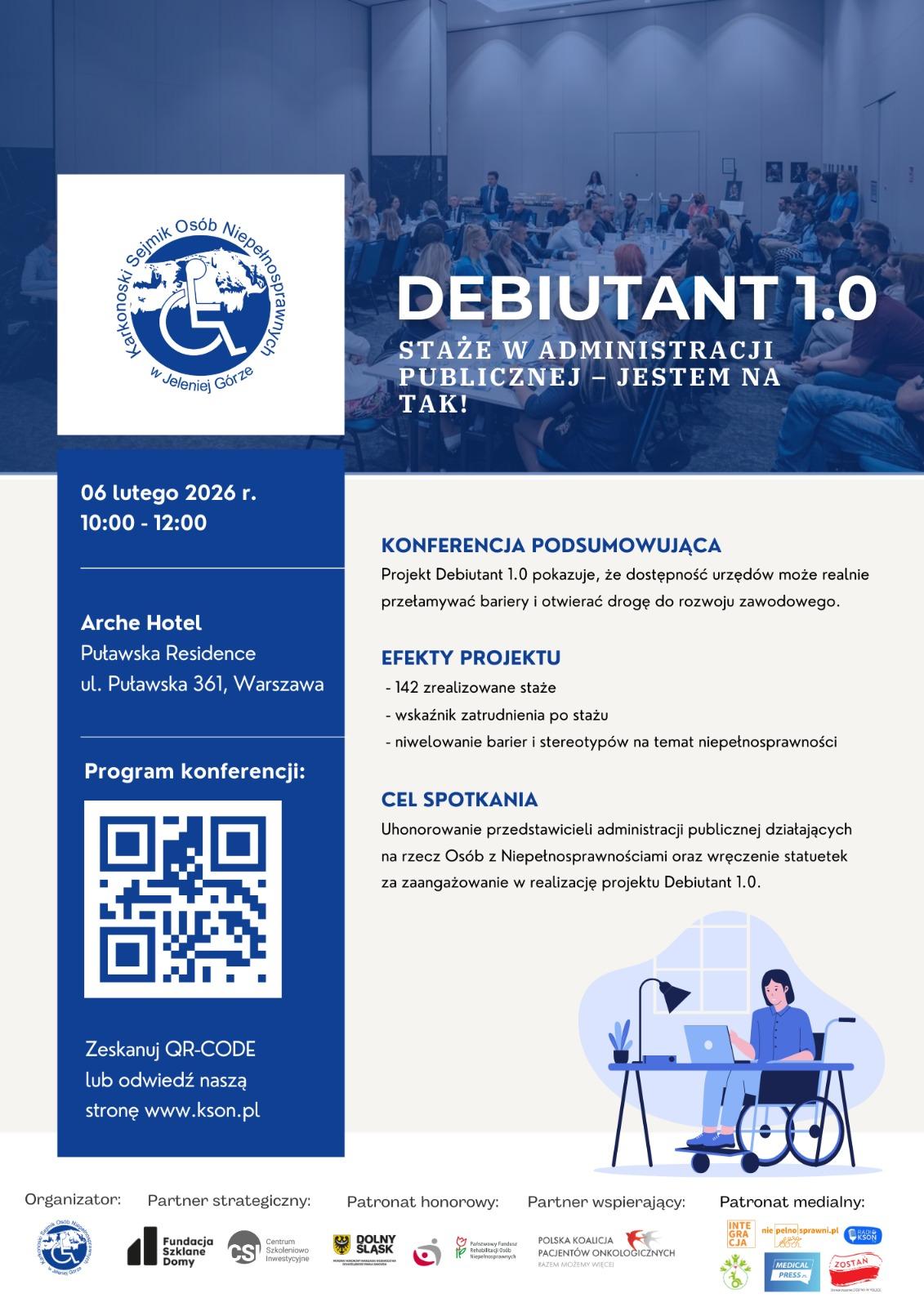 Konferencja będzie również okazją do uhonorowania instytucji, które zaangażowały się w realizację staży w ramach projektu „Debiutant 1.0”. Tego sukcesu nie byłoby bez otwartości i współpracy administracji publicznej, która realnie wsparła osoby z niepełnosprawnościami na drodze do samodzielności zawodowej.