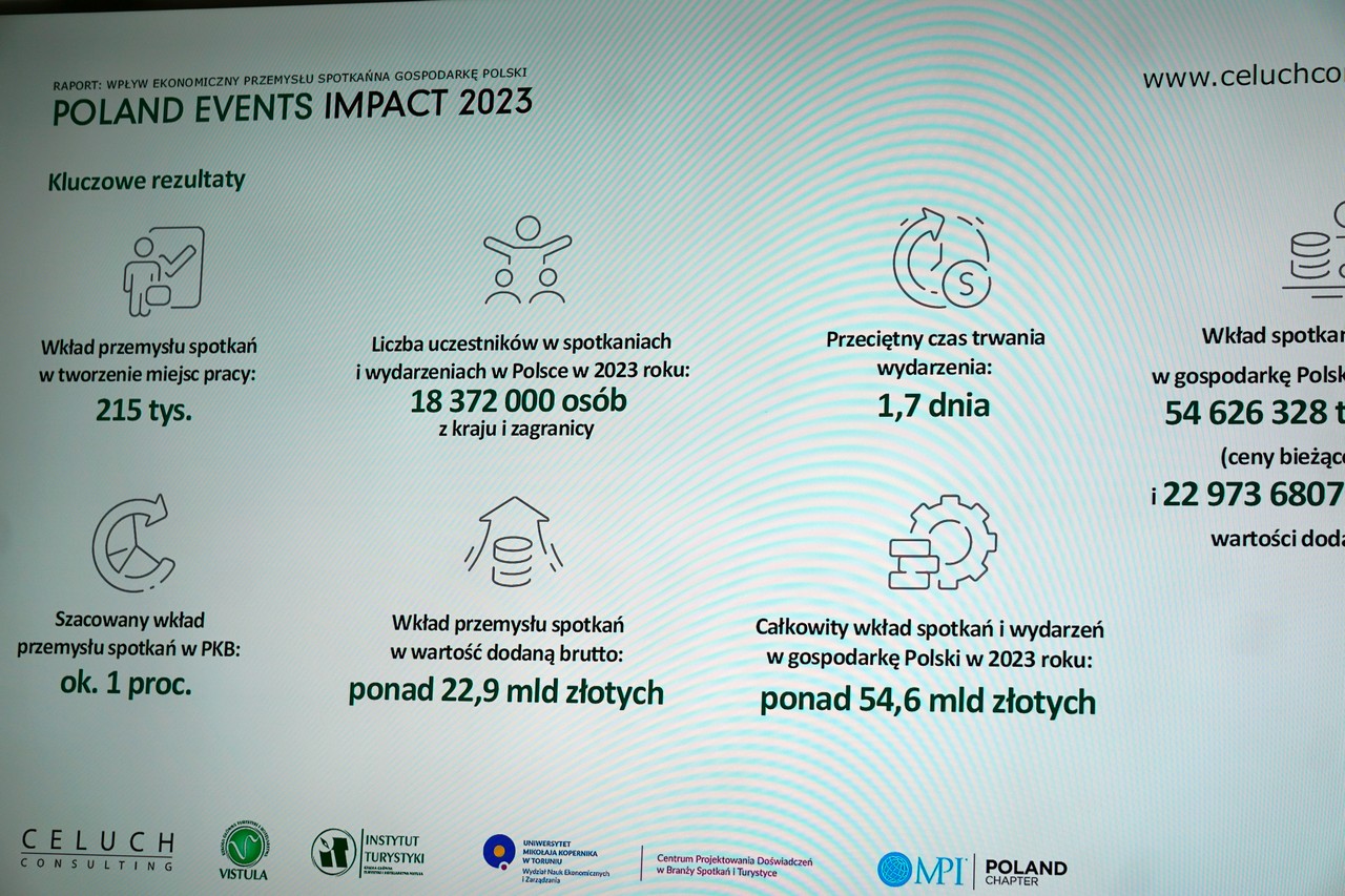 Z raportu POLAND EVENTS IMPACT 2023 wynika między innymi, że w 2023 roku liczba miejsc pracy, którą stworzył przemysł spotkań to 215 000, a wkład spotkań i wydarzeń w tym czasie zasilił polską gospodarkę kwotą 54,6 mld złotych.